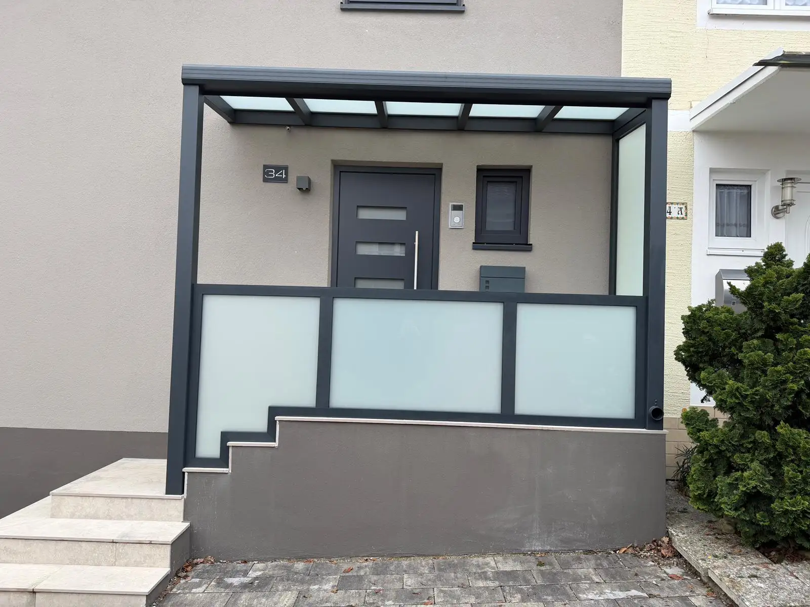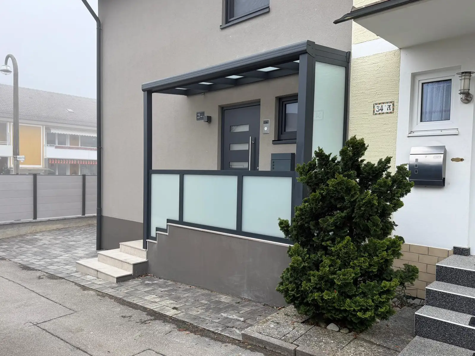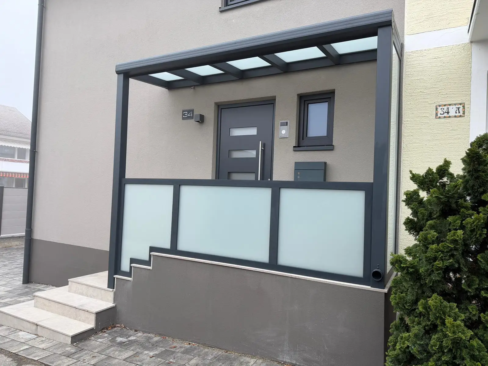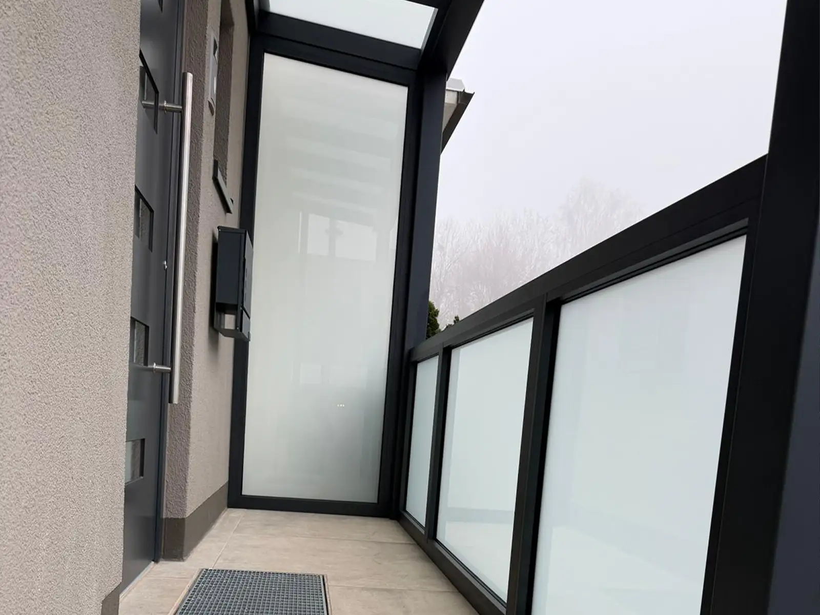 Seitlich wurde eine Festverglasung aus 8 mm mattiertem Glas integriert. Diese sorgt für zusätzlichen Wind- und Sichtschutz im Eingangsbereich und erhöht den Komfort deutlich.